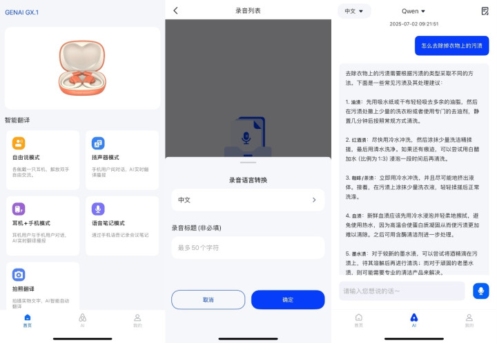 惊喜功能方面,歌奈 GENAI GX.1 联合智慧声联打造了 AI 智能助手,能答疑解惑。实时翻译支持三种模式随心切换,可扫清沟通障碍;语音转文字功能则省去了手动记录的繁琐,成为职场人提升效率的秘密武器。